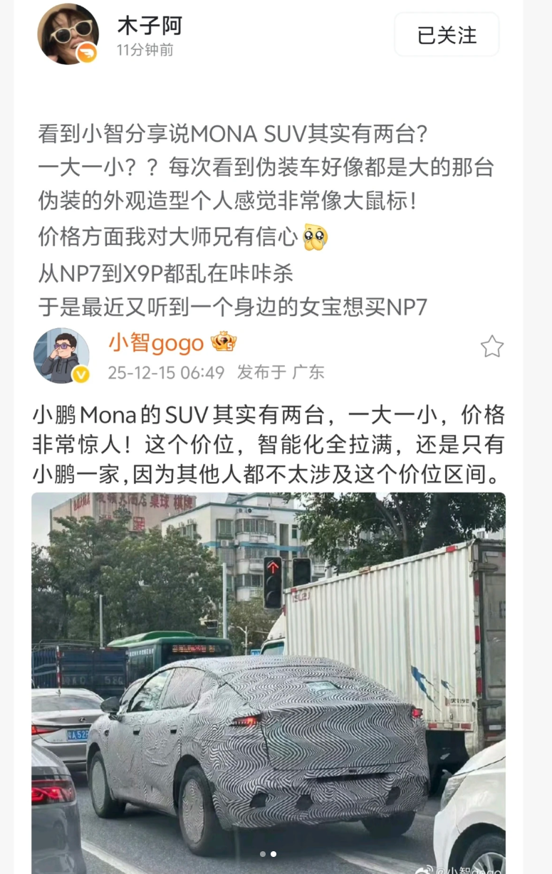 评论区里早已讨论得热火朝天,有人纠结 “选大的增程版还是小的纯电版”,有人担心 “双车同时推进,品控能不能稳住”,但更多人在等价格:“从 NP7 到 X9P,小鹏的定价一直很有惊喜,这两台 MONA SUV 只要价格到位,同级别真没对手”。还有不少女性消费者表示关注,之前就有网友提到身边朋友想买 NP7,如今 MONA SUV 的消息一出,“尺寸合适、智能好开、价格亲民” 的标签,让不少女性用户直接加入蹲守队列。